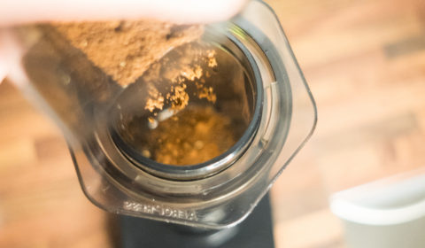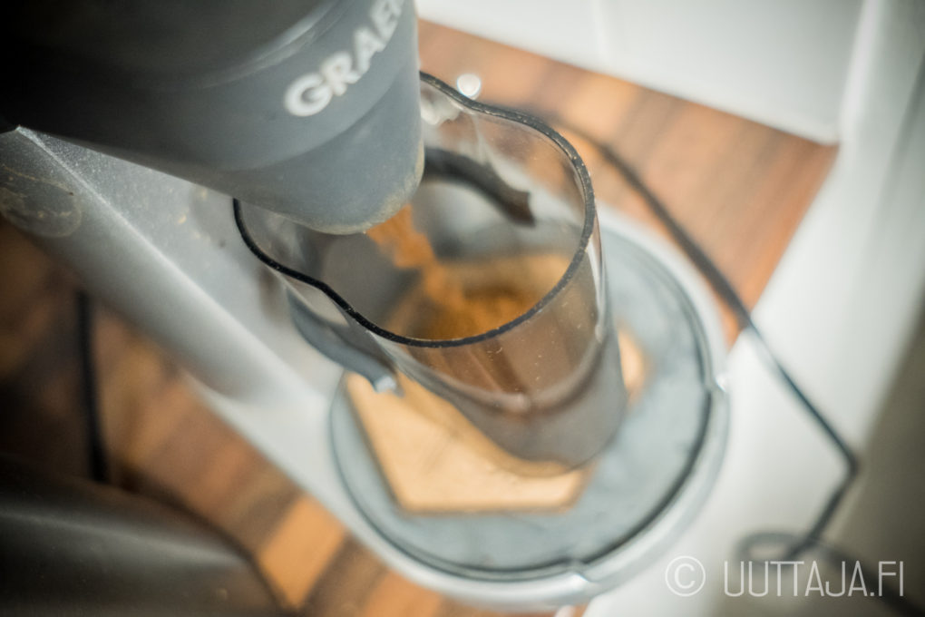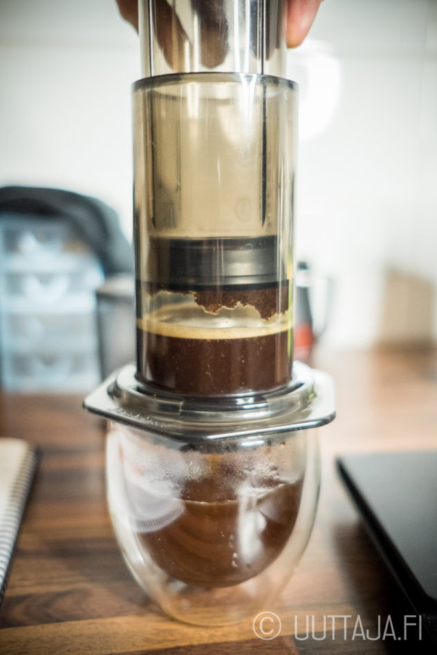 Valmistaminen tapahtui niin, että mittasin ensin esilämmitettyyn Aeropressiin kahvin. Tämän jälkeen kaadoin kaiken veden siihen perään ja sekoittelin muutaman kerran, jotta kaikki kahvi varmasti on kosketuksissa veden kanssa. Sekoitettuani annoin kahvin uuttua minuutin ajan ja sinä aikana esikastelin suodatinpaperin. Suodatin vielä tuubin päälle, kääntö lasin kanssa ympäri ja painallus 30 sekunnissa kuppiin.