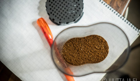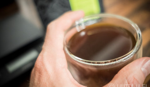 Valmistaminen tapahtui niin, että mittasin ensin esilämmitettyyn Aeropressiin kahvin. Tämän jälkeen kaadoin kaiken veden siihen perään ja sekoittelin muutaman kerran, jotta kaikki kahvi varmasti on kosketuksissa veden kanssa. Sekoitettuani annoin kahvin uuttua minuutin ajan ja sinä aikana esikastelin suodatinpaperin. Suodatin vielä tuubin päälle, kääntö lasin kanssa ympäri ja painallus 30 sekunnissa kuppiin.