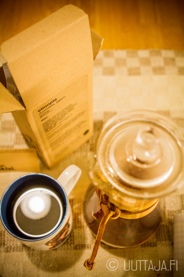 Keskipaahtoiseksi, tai tummaksi keskipaahdoksi, paahdettu Duromina päätyi Chemexillä valmistettavaksi. Se on monta kertaa aiemminkin osoittautunut etiopialaisten kanssa parhaaksi menetelmäksi ja luotin siihen tälläkin kertaa. Papuja hypistellessä kiinnitin huomiota niiden voimakkaaseen tuoksuun. Pavuista nimittäin tulvahteli miellyttävän raikas, pirteän marjaisa ja appelsiininen tuoksu.