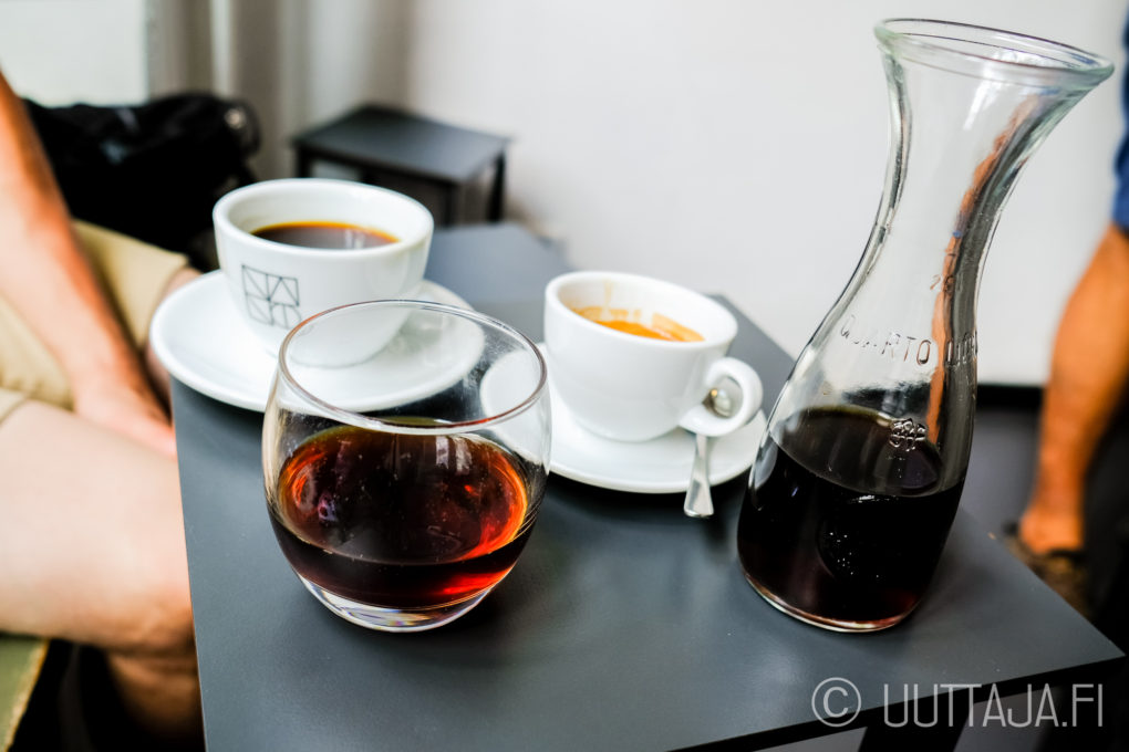 Suodatinkahvi oli tumman meripihkan sävyinen, hyvin pehmeä ja kevyt ja sen maussa oli mukava omenaisuus, suklaisuutta ja viipyilevä, makeahko jälkimaku. Varsinkin suklaisuus oli läsnä myös espressossa, mutta muuten oli kuin olisi juonut kahta tyystin eri kahvia.