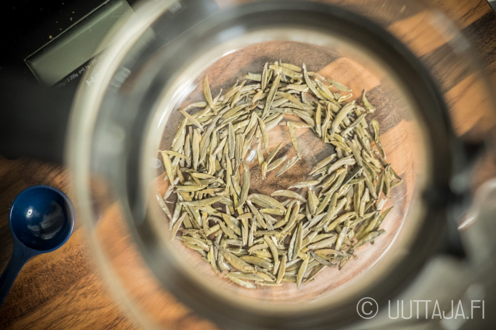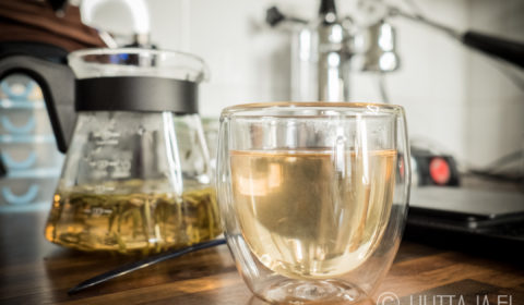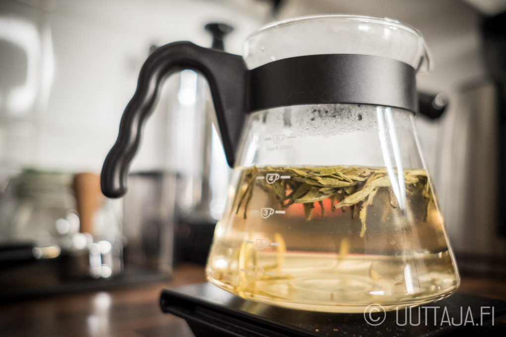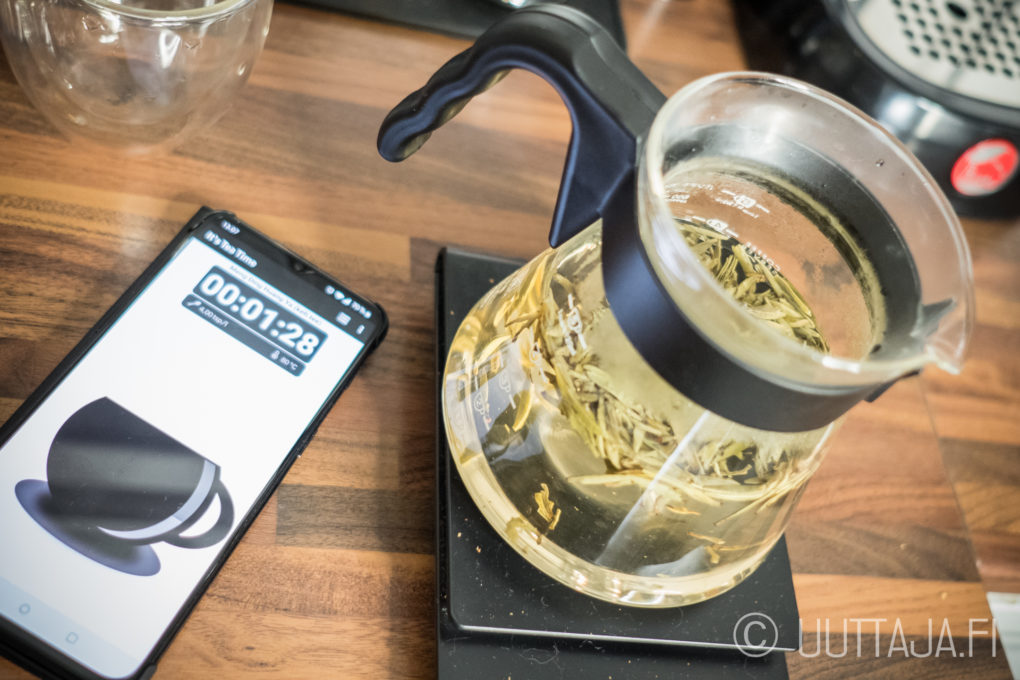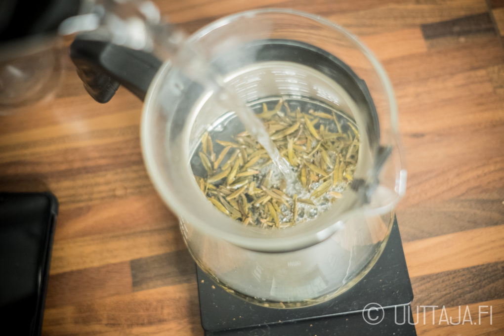 Haudutusohje löytyi pakkauksen etiketistä: 1-2 teelusikallista lehtiä yhteen kupilliseen (n. 2-2,5dl), vesi 75-80 -asteista ja haudutusaika 1-3 minuuttia halutun voimakkuuden mukaan. Päätin tehdä reilun annoksen, eli viisi desiä. Käytin neljä teelusikallista teenlehtiä ja 80-asteista vettä. Haudutusajaksi säädin ajastimeen 2:30 min.