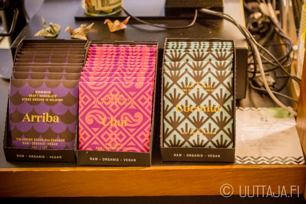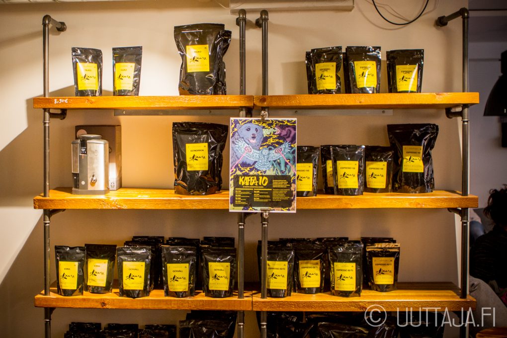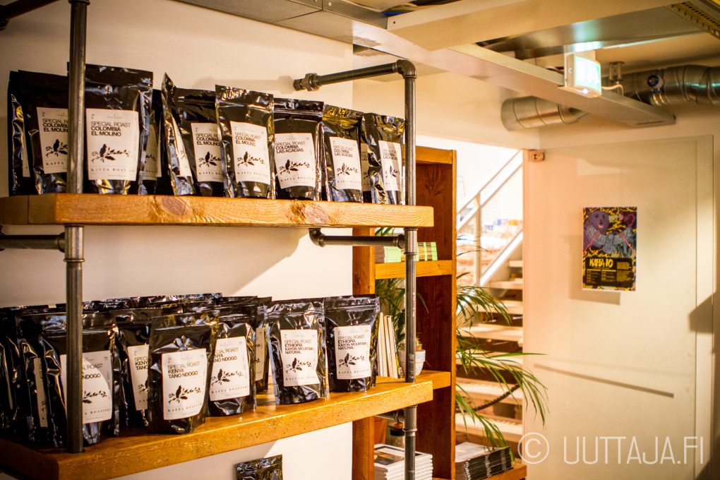 Kuten asiaan kuuluu, saa kahvila-myymälän puolelta ostettua kotiinviemisiksi kahveja sekä valmistusvälineistöä. Valikoima on todella kattava ja myyntiartikkelit näyttävästi esillä upeissa metallista ja puusta askarrelluissa hyllyissä. Löytyypä tiskiltä myös jotain pieneen makeannälkään ja suklaahiirille. Mukaani lähti Kaffan kasaama pussillinen paahtimon tuotteita (neljä eri kahvia papuina), pieni infokortti sekä myymälän puolelta aito oikea cupping-lusikka. Kauan olen moista etsiskellyt ja nyt minulla sellainen on. Kiitokset Karille yhteistyöstä!