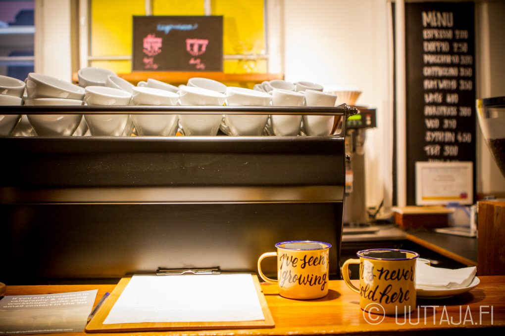 Jälleen huomionarvoinen seikka, hyvät naiset ja herrat: missään ei näkynyt kahvipannua lämpölevyllä käristymässä ja korventumassa! Sen sijaan tiskiltä löytyi kahvimylly, Aeropressejä, Harion V60- manuaalisuodattimia sekä hanhenkaulaisia vedenkaatimia kahvin valmistamista varten. TÄLLAINEN on hyvä kahvila.