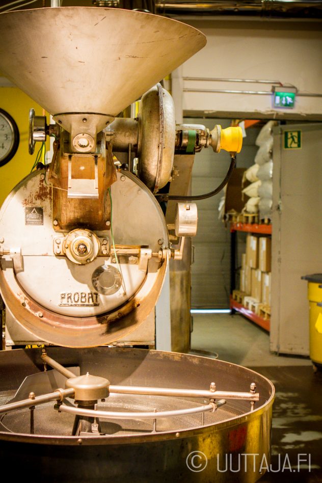 Onko mitään hienompaa, kuin iäkkäät saksalaiset Probat-paahtimet? Kaffan paahdin on niin sanottu ”parikymmenkiloinen” eli raakapapua mahtuu koneeseen kerrallaan noin 20 kiloa. Työtahti paahtimella ja paahtajalla on näinollen about 60 kiloa tunnissa. Samassa tilassa paahtimen kanssa ovat myös raakakahvisäkit ja -tynnyrit.