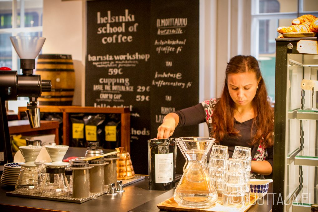 Kello oli viiden, kun aloin tehdä lähtöä eteenpäin. Kahvilassa oli 12 asiakasta, osa kaveriporukalla hengaamassa, osa valikoi hyllyistä kahvia tai laitteita ostettavaksi ja pari herrasmiestä siemailivat kahvejaan Macbookit auki selkeästi töiden parissa ähertäen. Kaffan tilat ovat kieltämättä sellaiset, että voisin itsekin kuvitella siellä istuvani töitä tekemässä. Ja mikäs siinä olisi naputellessa, kun lasiseinän takana tapahtuu sitä kaikkein kauneinta kahviasiaa ja tiskiltä saa selän takana paahdettua kahvia juotavaan muotoon uutettuna. Valitsemallasi metodilla tottakai. Kaffa on muuten kuulemani mukaan Suomen kolmanneksi suurin paahtimo. Kaffa työllistää 24 henkilöä.