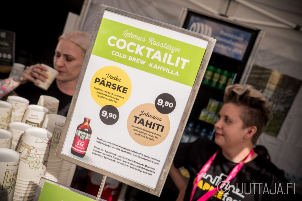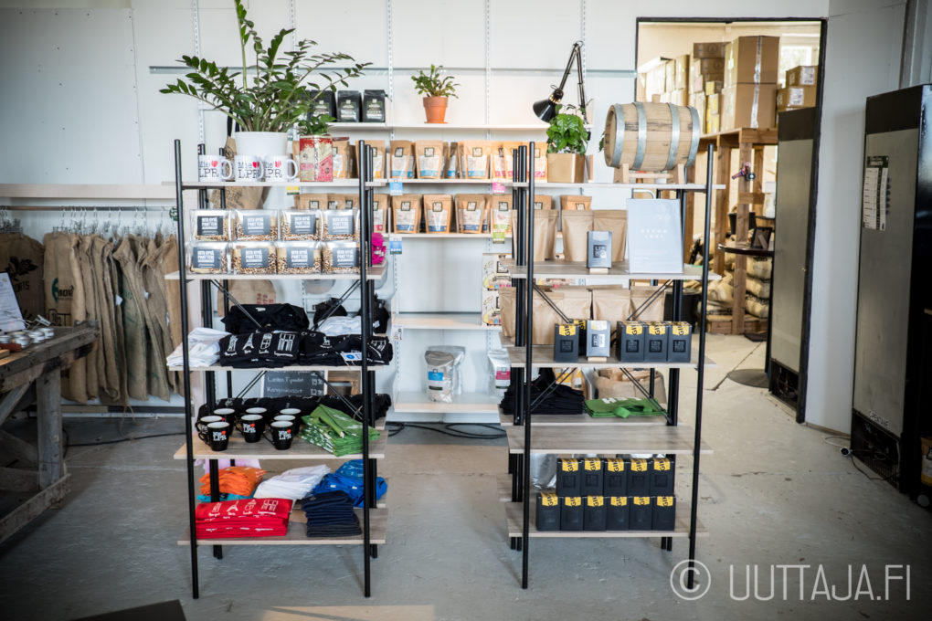Lehmus Roasteryn raakakahvit tulevat pääasiassa Cafe Importsilta sekä Falcon Coffees:lta, vaikka näytteitä sateleekin myös muilta tahoilta ja ympäri maailman. Paahtimo on tullut molemmille edellämainituille toimittajille jo hyvin tutuksi ja tahot ovat tekemisissä keskenään enemmässäkin määrin. Esimerkiksi olutharrastajia löytyy molemmista leireistä. Lehmuksen paahtimon kalustoon kuuluu 15 kilon rummulla varustettu Giesen-paahtokone, joka varmasti joutuu koville kiireaikoina. Toistaiseksi paahtotyö on pystytty tekemään yhdessä vuorossa, mutta hetkittäin on ollut tarvetta jatkaa paahtamista pidemmälle iltaan. ”Visa hoitaa”, kuten Arttu totesi. Joulu on Lehmuksellekin kiireistä aikaa. Myös kesäkuun alku oli kuulemma saanut hien pintaan, kun ihmiset olivat tilailleet juhannukseksi kahveja. Omanlaisen kiireensä ja häslinkinsä sai aikaan myös alkoholijuomien mukaantulo tarjontaan ja sen myötä tiskin remontointi ja kohennus. Ja kun tässä ei ollut vielä tarpeeksi, niin Satamatie 6 juhlisti 1-vuotissyntymäpäiväänsä kesäkuun ensimmäisenä viikonloppuna (viikkoa ennen kuin allekirjoittanut pääsi itse paikalle), jolloin tupa oli käytännössä katsoen täynnä. Paikalla synttäreitä juhlistamassa ja baristojen apuna olivat myös Cappuzine-kahvipodcastia tekevät Jarno Peräkylä sekä Samuli Parkkinen. Miehet tarjosivat myös auttavan kätensä tiskin takana ja valmistivat asiakkaille espressoja ja muita kahvijuomia.