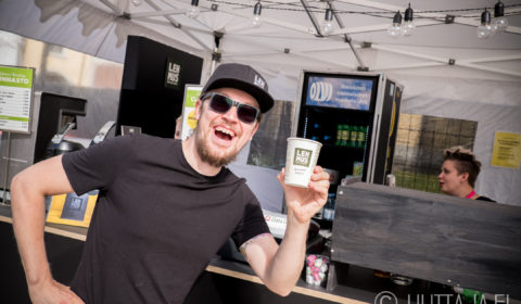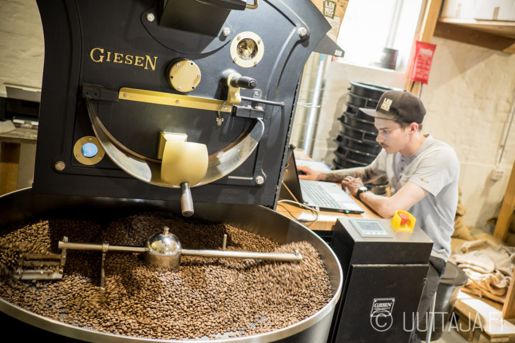 Lehmus Roasteryn raakakahvit tulevat pääasiassa Cafe Importsilta sekä Falcon Coffees:lta, vaikka näytteitä sateleekin myös muilta tahoilta ja ympäri maailman. Paahtimo on tullut molemmille edellämainituille toimittajille jo hyvin tutuksi ja tahot ovat tekemisissä keskenään enemmässäkin määrin. Esimerkiksi olutharrastajia löytyy molemmista leireistä. Lehmuksen paahtimon kalustoon kuuluu 15 kilon rummulla varustettu Giesen-paahtokone, joka varmasti joutuu koville kiireaikoina. Toistaiseksi paahtotyö on pystytty tekemään yhdessä vuorossa, mutta hetkittäin on ollut tarvetta jatkaa paahtamista pidemmälle iltaan. ”Visa hoitaa”, kuten Arttu totesi. Joulu on Lehmuksellekin kiireistä aikaa. Myös kesäkuun alku oli kuulemma saanut hien pintaan, kun ihmiset olivat tilailleet juhannukseksi kahveja. Omanlaisen kiireensä ja häslinkinsä sai aikaan myös alkoholijuomien mukaantulo tarjontaan ja sen myötä tiskin remontointi ja kohennus. Ja kun tässä ei ollut vielä tarpeeksi, niin Satamatie 6 juhlisti 1-vuotissyntymäpäiväänsä kesäkuun ensimmäisenä viikonloppuna (viikkoa ennen kuin allekirjoittanut pääsi itse paikalle), jolloin tupa oli käytännössä katsoen täynnä. Paikalla synttäreitä juhlistamassa ja baristojen apuna olivat myös Cappuzine-kahvipodcastia tekevät Jarno Peräkylä sekä Samuli Parkkinen. Miehet tarjosivat myös auttavan kätensä tiskin takana ja valmistivat asiakkaille espressoja ja muita kahvijuomia.