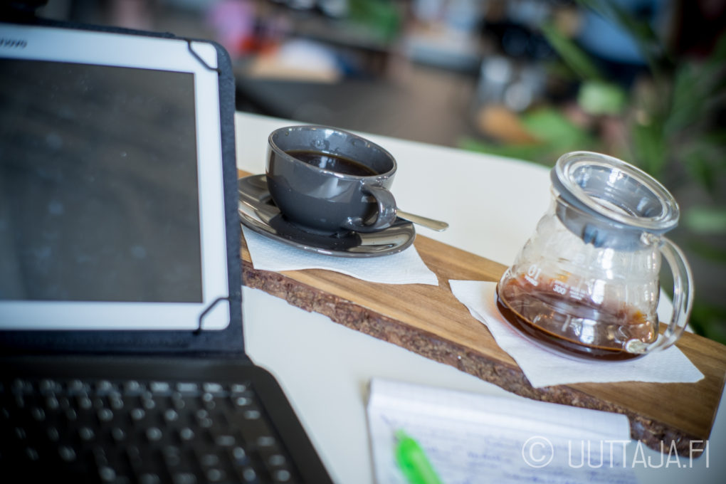Paahtimolla Arttu järjesti ohjelmanumeroksi cuppingin. Pöydälle valittiin valikoimasta pari perustuotetta, kaksi Limited-sarjan kahvia sekä uutuuksia. Tarkempi listaus cupatuista kahveista: Muukko, Pusupuisto, Kenya Gikirima AA, Ethiopia Gesha 1931, juuri samana päivänä lanseerattu Tuska-festivaalikahvi, erikoispaahto kofeiiniton Honduras sekä perulainen uutuuskahvi, jonka nimi jäi vielä kysymysmerkiksi. Perulaisesta on henkilökunnalla kokeilussa sekä vaaleapaahtoinen että tummempi versio ja meidän cuppingiin päätyi tämä tummempi. Voin vakuuttaa, että huonoa kahvia ei pöydässä ollut. Kofeiiniton oli ehkä hivenen mauttomaksi jäänyt paahto, perulainen aavistuksen liian tumma (maut peittyvät) ja Muukko oli poikkeuksellisen voimakkaan makuinen. Tuska-festivaalikahvi oli sanansa mukaan tummaa, muttei mikään ääriöveri. Suutuntuma oli uskomattoman pehmeä. Voin Tuska-metallikinkereille osallistuville sanoa rehellisesti, että kahvihampaan kolotuksen hoito on annettu asiantunteviin ja hyviin käsiin!