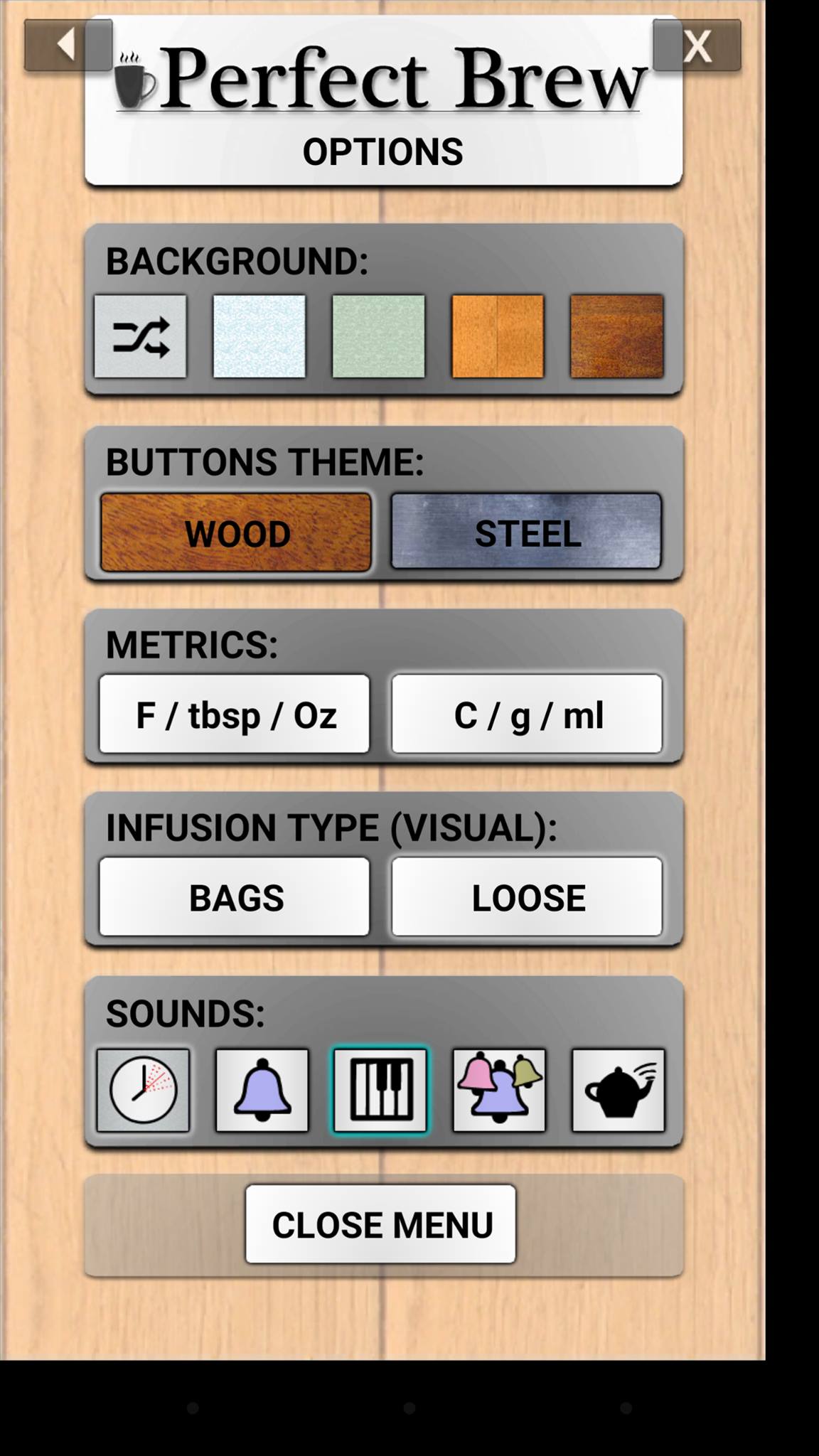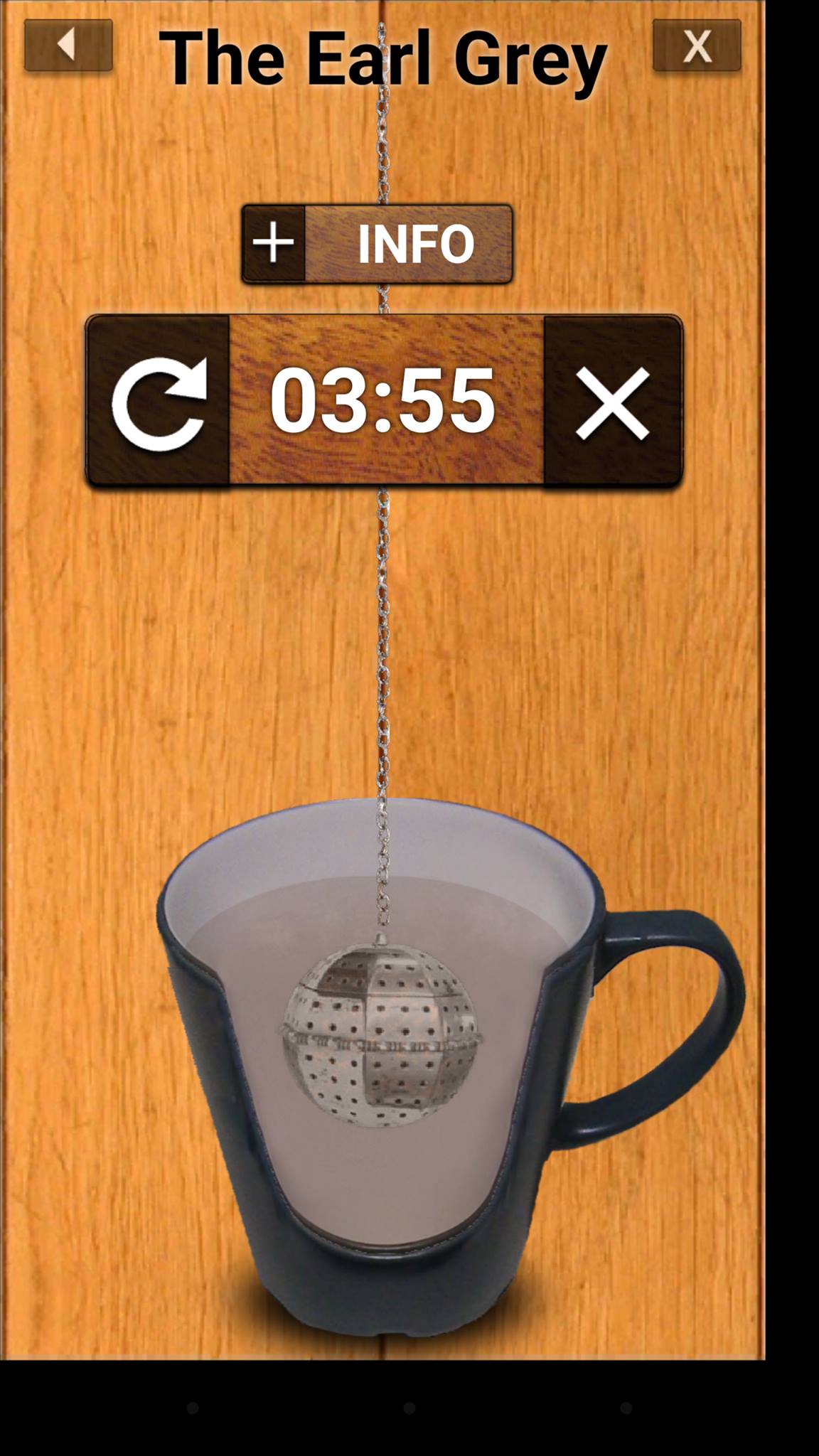 Brewing timer is started by insterting the tea ball or tea bag into the water. When the time is up the app rings an alarm which you can choose from the options menu. Options menu also gives you chance to edit the outlook and the metrics. And you can choose between tea bags or loose leaf tea to brew.