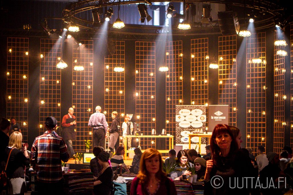 Tila oli tunnelmavalaistu, ilmassa leijui hento savukonesavu ja tuoksuissa piisasi. Taustalla soivat DJ:n valitsemat tunnelmaatuovat kappaleet. Kaapelitehdas oli jälleen täynnä näytteillepanijoita ympäri Suomen ja tarjontaa olikin jälleen laidasta laitaan; Lotta Svärd -järjestön tarjoilemasta korvikkeesta aina turkkilaiseen kahviin ja Kopi Luwak -kissankakkakahviin saakka. Olipa paikalla myös Kissakahvila Purnauskis:n edustajia. Näytteillepanijat olivat suurin osa tuttuja jo viime vuodelta, mutta muutama nimi valitettavasti loisti poissaolollaan: Kaffe Obscura, Paahtimo Papu, Turun Kahvipaahtimo ja viime vuonnakin poissa ollut Rovaniemen Kahvipaahtimo eivät Kaapelitehtaalla tänä vuonna tuotteitaan tarjoilleet. Sen sijaan muutama uusi tuttavuus oli paikalle saapunut.