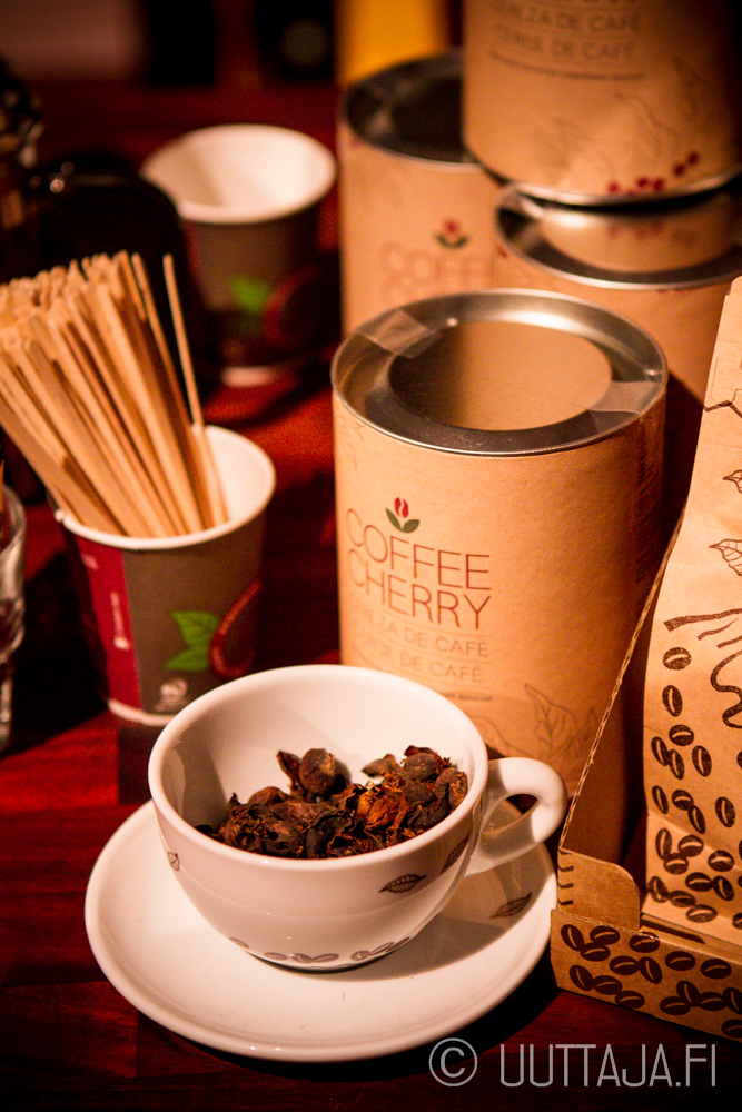 IMG_5900IMG_5699Toinen mielenkiintoinen kokeiluluontoinen tuttavuus oli Pirkanmaan Paahtimon kojulta löytynyt kuivatuista kahvimarjoista uutettu juoma. Ainesosat ja -sisältö ovat periaatteessa samat kuin uutetussa kahvissa, mutta tämän valmistukseen on käytetty kuivattujen kahvimarjojen hedelmäliha- ja kuoriosuus (eli se osa, joka normaalisti menisi kahvikäsittelyssä kompostiin tai jätteeksi). Maku oli todella mainio: pirteyttä, marjaisuutta ja makeutta ilman kitkeryyttä tai vahvaa hapokkuutta. Tätäkin lähti purkin verran meikäläisten matkaan ja sitä maistellaan ihan varmasti vielä blogissakin. Jos muistan oikein niin näiden kerrottiin olevan eräänlainen koe-erä.
