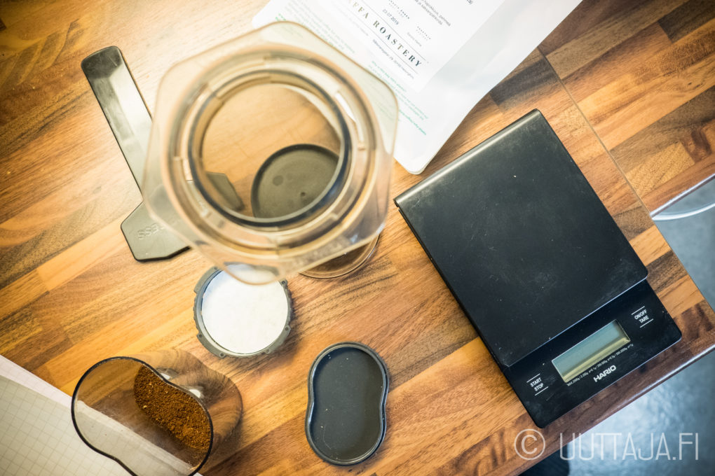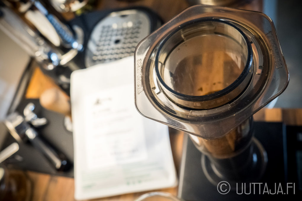 Aeropress-resepti oli jälleen tuttu ja turvallinen: 15 grammaa kahvia, 230 grammaa 90-asteista vettä. Tuubiin kahvin päälle puolet vedestä ja huolellinen sekoitus. Tämän jälkeen loput vedet päälle, uuttamista suodatinpaperin kastelun verran, korkki paperin kera tuubin huulille, lasi päälle ja torni ympäri. Painallus lasiin 30 sekunnissa (siihen kunnes sihinä alkaa kuulumaan, ei pohjaan asti).