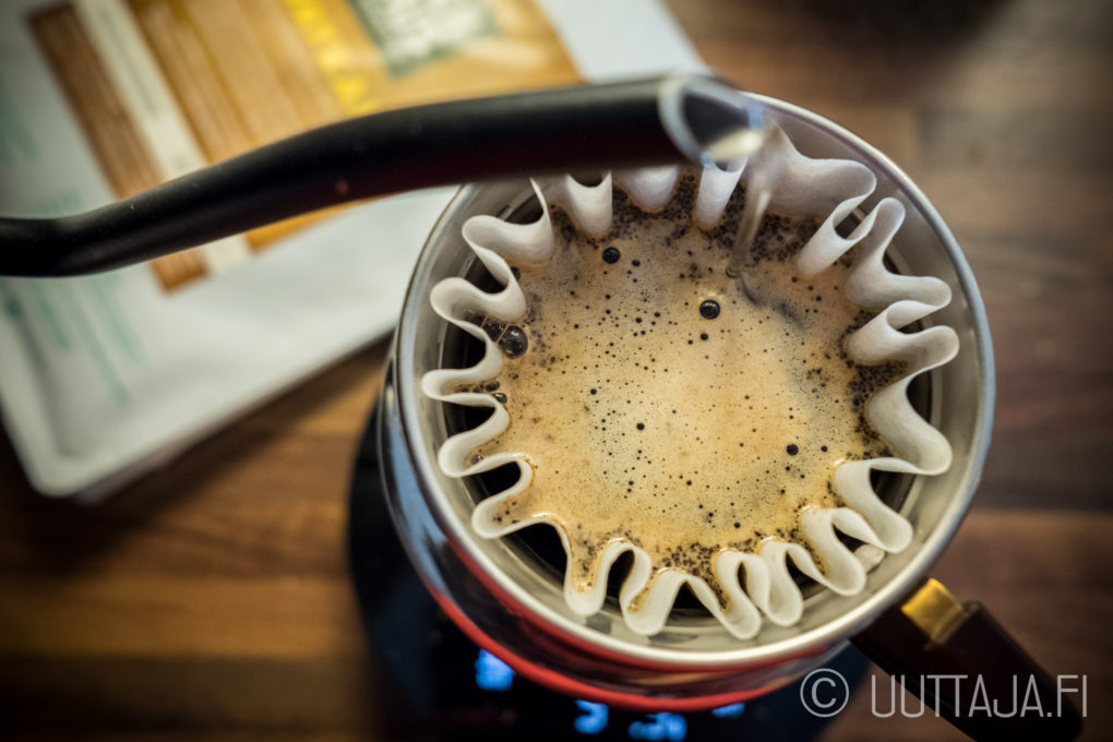 Resepti Waykanille: 15 grammaa jauhettua kahvia (karkeus suodatinkarkeutta hienompi) ja 250 grammaa vettä (veden lämpötila noin 92 astetta). Vedestä kahvin päälle ensin noin 60 grammaa ja 30 sekunnin blooming käyntiin. Sitten vettä 90 grammaa lisää, pieni odotus ja hitaasti lorotellen loput vedet niin, että lopulta vaaka näyttää luvuksi 250 grammaa. Kokonaisuuttoajaksi kupilliselle tuli näin hieman alle pari minuuttia.