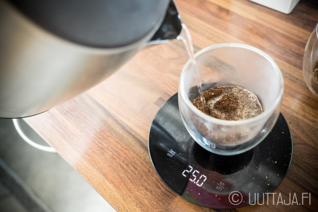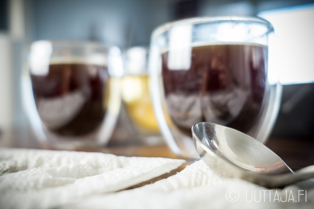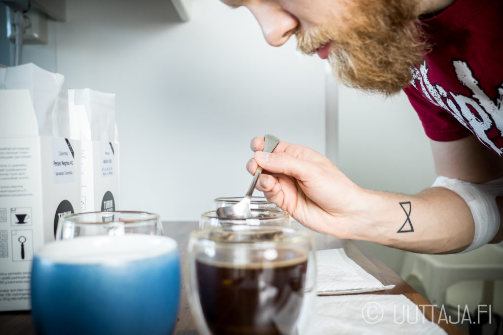 Tietenkään pelkkä tuoksuttelu ei riitä. Makuun oli päästävä myös käsiksi. 12 kahvigramman päälle kaksi desiä kuumaa vettä per lasi ja tovi odottelua. Samalla lisää tuoksutteluja uusien havaintojen varalta. Sekoitusta ja kuorintaa, kunnes lopulta maistelulusikan pääsi upottamaan kahveihin siinä parhaassa mahdollisessa tarkoituksessa, eli tietenkin maistelussa.