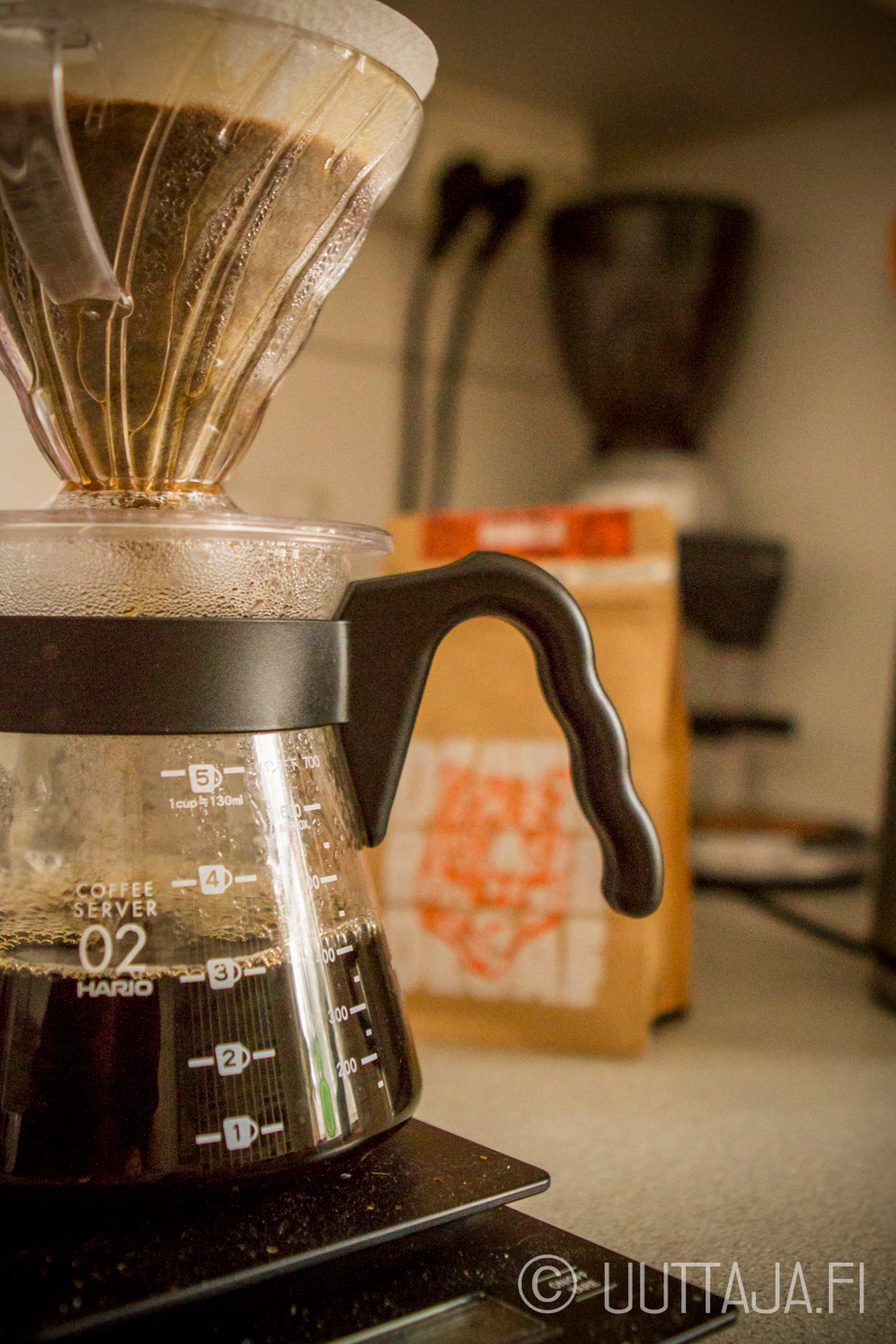 Kahvikissa-Mikko kiinnostui kahvista heti, kun pavut oli jauhettu V60-valmistusta varten sopivalle karkeudelle. Jauhetun kahvin tuoksusta erottui mausteisuutta, pavuista tuttua savuisuutta, tummaa paahteisuutta sekä pieni herukkaisuus. Tuoksu oli kokonaisuutena melkoisen tuhti, mutta pehmeä. Aluksi pallottelin tovin Hario V60 – ja pressopannuvalmistamisen välillä, mutta suppilo vei voiton tällä kertaa.